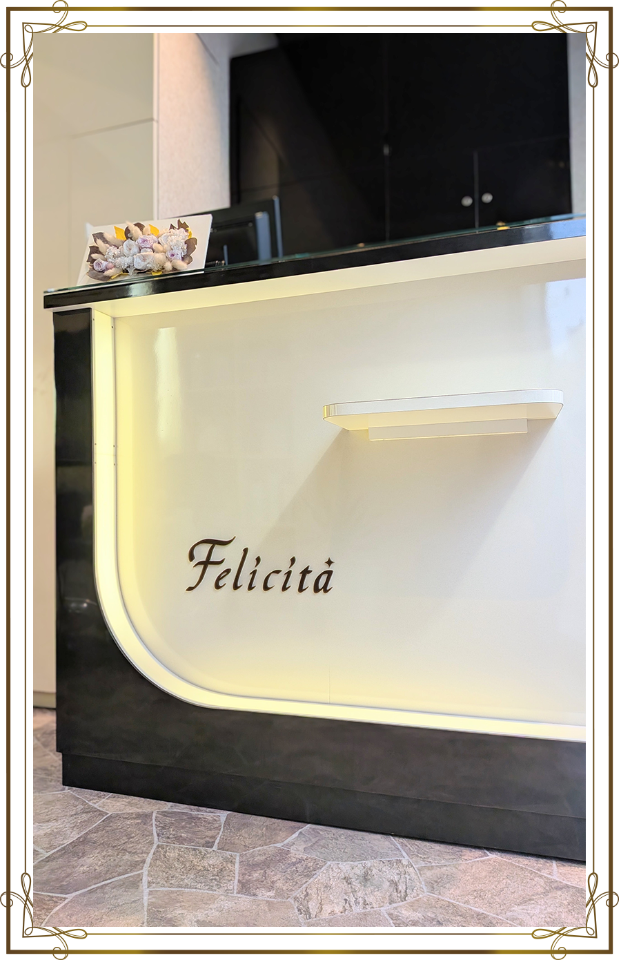 Felicita【イタリア語:『幸せ』の意味】あなたの『美のパートナー』を目指すサロンFelicita(フェリシータ)『来店してから帰るまでに幸せな気持ちになってもらえたら…』という願いを込めてつけられました。優しい光に包まれた、高級感と安らぎが共存した空間。そこで受ける心温まるおもてなしと繊細な技術は、いつもとは少し違う、贅沢な気分を味あわせてくれます。